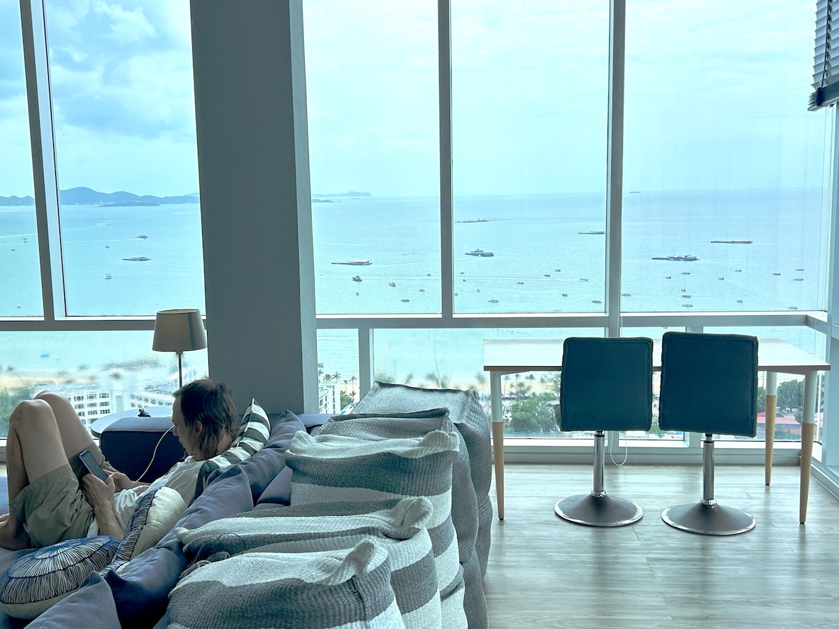 SEA AND POOL VIEWS HIGH ON HIGH FLOOR, 1 BDRM, 1 BATHROOM, 1 LIVING ROOM, 1 KITCHEN -TO SLEEP 4 PERSONS, PLEASE READ "THE SPACE" -2 swimming pools, gym -300m walks to Pattaya beach -3 mins walk to famous shopping centers, Central Festival, The Avenue -4 mins to Walking Street
