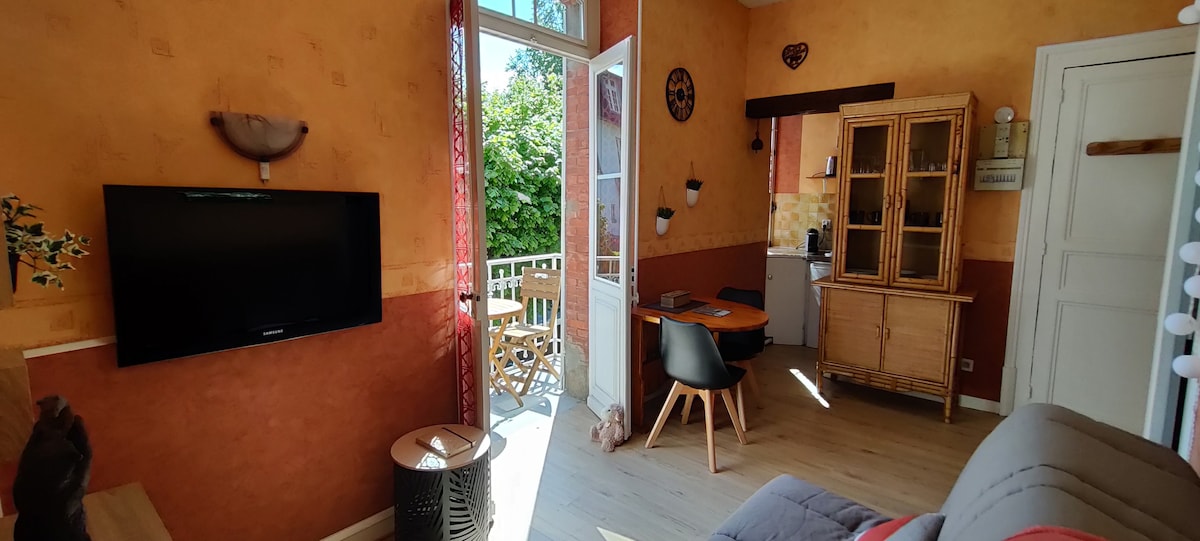 In the heart of Argelès-Gazost, charming apartment with south-facing balcony (with table + chairs) and mountain view on the 1st floor of the villa "Chalet Pax" in a peaceful and wooded area. Ideal location: park and thermal complex 100 m away; shops, restaurants and supermarket within walking distance. Private parking in the enclosed common garden. Secure bicycle/ski room. All linens are provided, beds are made upon arrival: all you have to do is put your bags down!