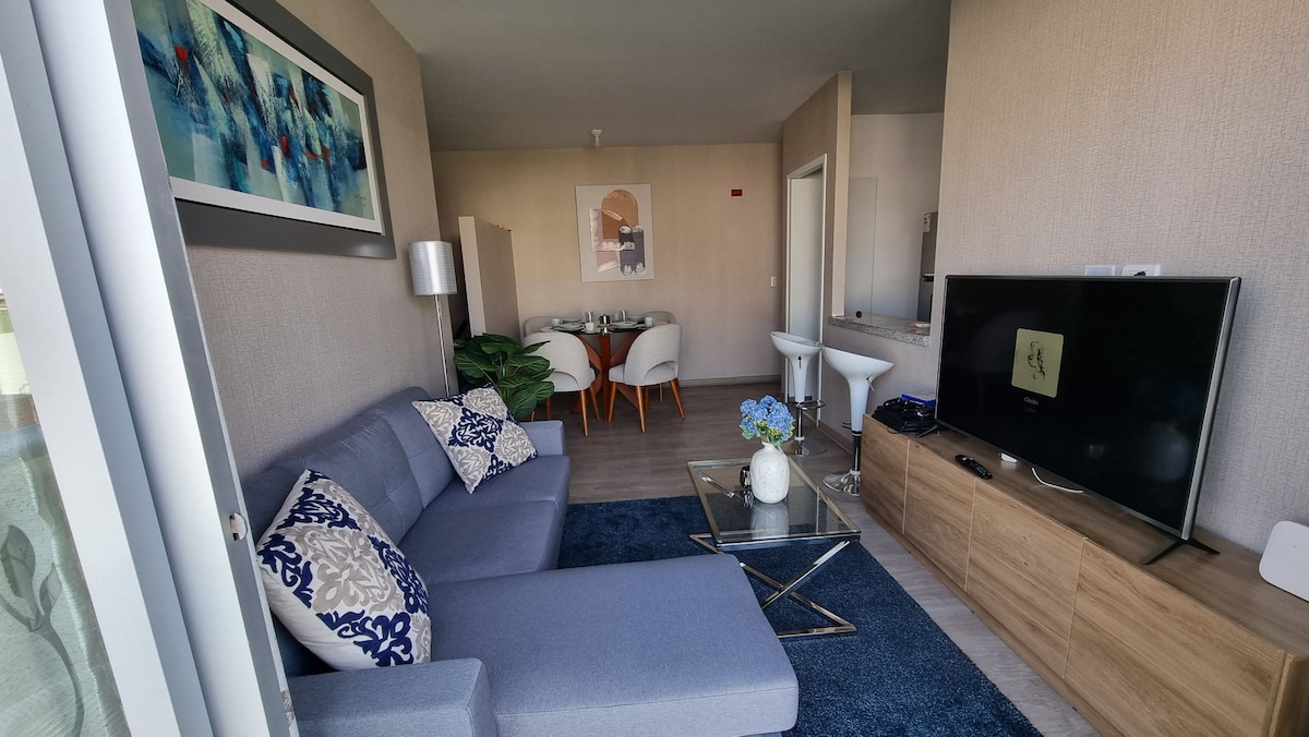 Este moderno y acogedor departamento es perfecto para la comodidad y tranquilidad. Disfruten de un espacio amplio y funcional con una sala espaciosa para relajarse, dos televisores equipados con Disney+ y Netflix, una cocina completamente equipada para preparar deliciosas comidas. Cuenta con un cómodo comedor y 2 baños modernos. Zona tranquila, cerca al Mall Aventura Plaza, a 20 min del centro. La ubicación es ideal para explorar Arequipa mientras disfrutan de un refugio sereno para descansar.