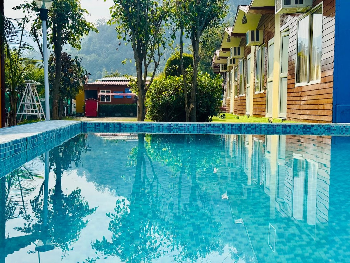 Key Highlights > Two Private Open air Natural Spring Pools > Astonishing view of Majestic Himalayas and ganga >Outdoor sitting area with warm Mood lightings >Organic Vegetarian/Vegan meals sourced right from our own farm(Nature Care Village). >Yogashala with Mountain view.