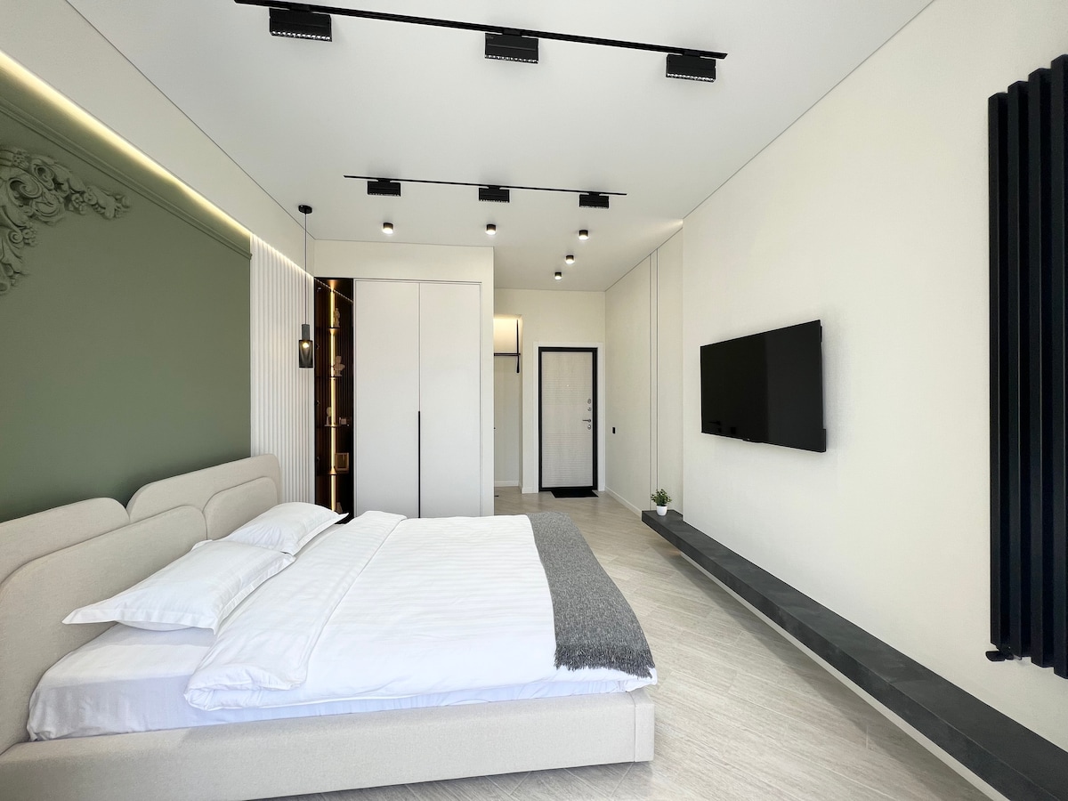 Recharge your batteries in this calm and stylish place. The new house is located near the park, Batyrmol shopping mall, there is all the necessary furniture, appliances and kitchen utensils for cooking. A comfortable bed with an orthopedic mattress, a bright design of the apartment will allow you to enjoy your rest and quality sleep. Large Smart TV with internet access, Wi-Fi, large bathroom and loggia. The courtyard is quiet, your car will be completely safe under video surveillance, there are shops nearby, a recreation area in the park