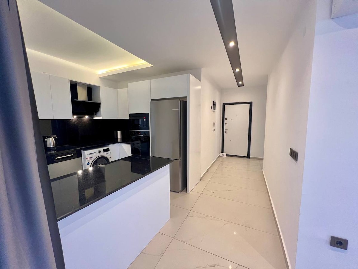Welcome to our stunning new condo, just 300m from Cleopatra beach! Our 2+1 apartment offers panoramic sea and mountain views from every window. The building is brand new and comes with a swimming pool, fitness area, garden, and free wifi. The first floor features a fully equipped kitchen, living room with a balcony, and a bathroom. Upstairs, you'll find two bedrooms with new mattresses, pillows, and bed sheets, and a bathroom with a warm floor. Each bedroom has its own air conditioning unit.