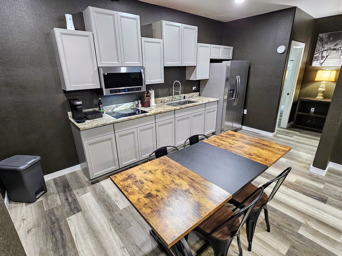 Rustic Gulch combines modern design with black and white accents throughout. The bright living room is bathed in natural light, and the fully equipped kitchen and spa-like bathroom offer ultimate comfort. The bedroom includes a queen-size bed with ample storage, while the loft upstairs features another queen bed and breathtaking views of Palo Duro Canyon. Outside, enjoy a private patio with a bistro table and grill. Located just minutes from the park entrance, it’s the perfect canyon getaway.