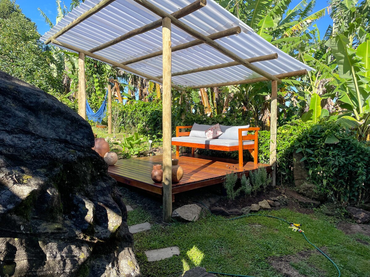 Chalet located at the top of the Paiol Grande neighborhood, near Pedra do Baú and the exit to the trails. Recently renovated and equipped for all basic kitchen and comfort needs. Large outdoor garden area all fenced (ideal for dogs), with fruit trees in the yard and a vegetable garden! Extremely cozy and quiet! 400M fiber optic internet available on site. We accept small 4-legged guests. :)