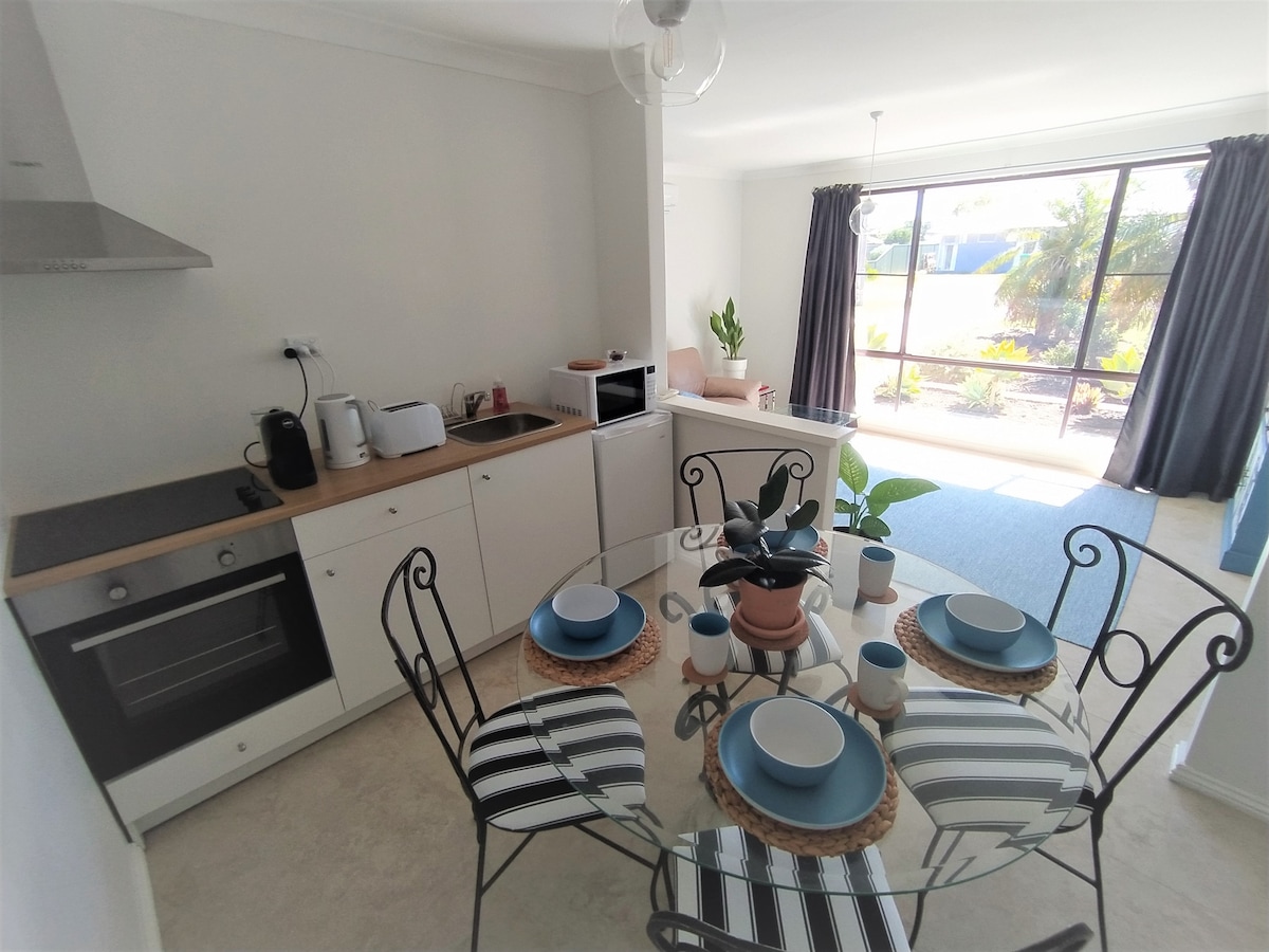 A renovated self-contained guest suite for singles, couples or small families. Only 900 metres walk or 2 min drive to the beautiful, peaceful Warnbro beach. Guests can share use of our 60,000-litre palm-fringed pool and outside dining area. Suite has a private entrance and comprises of living room, dining room/kitchenette, bedroom with queen-sized bed, walk-in wardrobe and bathroom.
