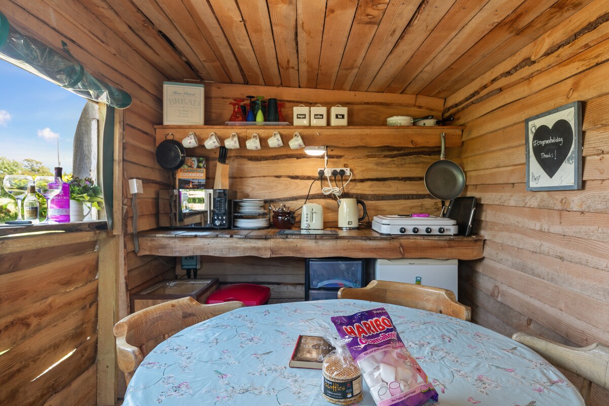 You'll love this amazing space, nestled at the foot of the hay field offering privacy, seculsion and total relaxation. Gaze up from your four poster bed and watch the clouds by day and the stars by night. Off grid eco luxury glamping at the next level. You'll have your own kitchen with cooker and hob, eco loo, hot shower and outside furniture. For the chilly evenings light the log burner and cosy up on the comfy arm chairs. We hope we've thought of everythingto make your stay truely memorable.
