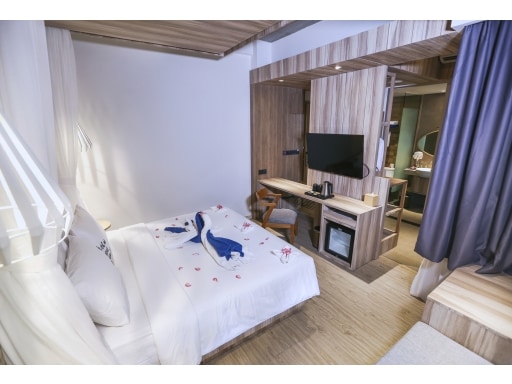 Deluxe Chamber Room is 22m Sqm fitted with a Satellite TV, AC and a seating area. The comfy adjustable soft mattress. Breakfast is included in à la carte and American options. The on-site restaurant, serves Indonesian and international cuisine. Located in the Centre area about 100 m walk from the Harbor, the resort is in the entertainment district beach front with an outdoor pool. Popular area for cycling; Sunset Point is 1.7 km. The resort offers a 24-hour front desk and concierge service