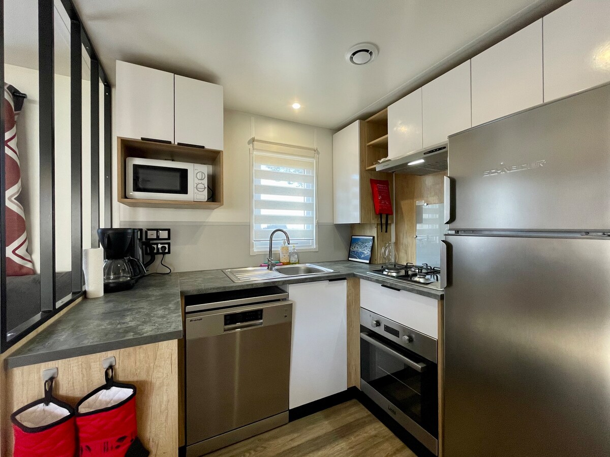 Our ocean view mobile home sleeps 4 people comfortably. 1 equipped KITCHEN, 12-place dishwasher, 5 kg washing machine, combined fridge, electric oven, microwave, kettle, toaster... 1 BEDROOM with 140 cm double bed, dressing room, 1 BEDROOM 2 80 cm single beds, closets, 1 comfortable BATHROOM with shower and sink, 1 separate toilet with hand wash, 1 LIVING ROOM dining area, living room, TV, heating available, 1 furnished TERRACE, outdoor furniture/barbecue.