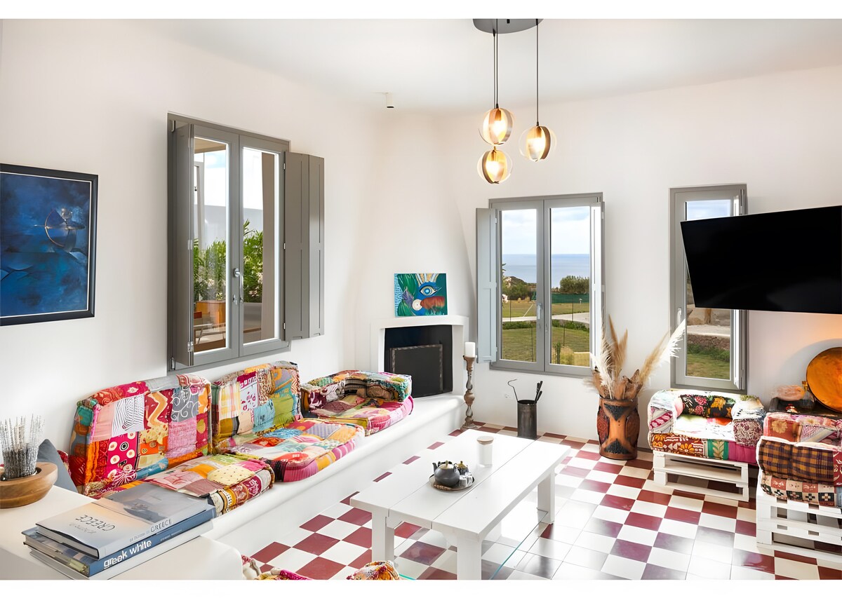 “Villa Soleil” is a beautiful Cycladic House, with a stunning sea view from each point of the house, comfy and functional, ideal for a family or a big party vacation. If you are looking for a peaceful getaway, the space and the view will totally reward you! Our garden is full of local plants, flowers and herbs and features a large sea view jacuzzi that will also add to your moments of relaxation watching the sea just in front of you!