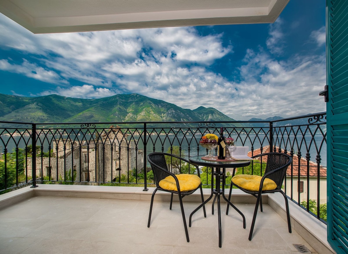 One of the 10 most wishlisted homes on Airbnb ever as shown in Airbnb's article "Where Everybody Wants to Stay: 10 of Our Most Wish Listed Homes" Right next to the Perast museum, our studio apartment has a spacious terrace with a magnificent view on the two most beautiful attractions of the Bay of Kotor: islands of Sv. Đorđe and Lady of the rocks.