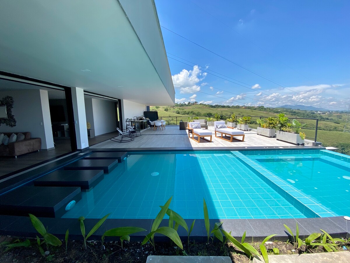 Elegant house with modern finishes and generous spaces just 15 minutes from Pereira with a spectacular view of both cities. Enjoy a spectacular infinity pool, heated jacuzzi, sauna, Turkish bath, 2 fireplaces, BBQ and barrel for roasts, social area with lighting system, covered parking, catamaran-type mesh and large green areas.