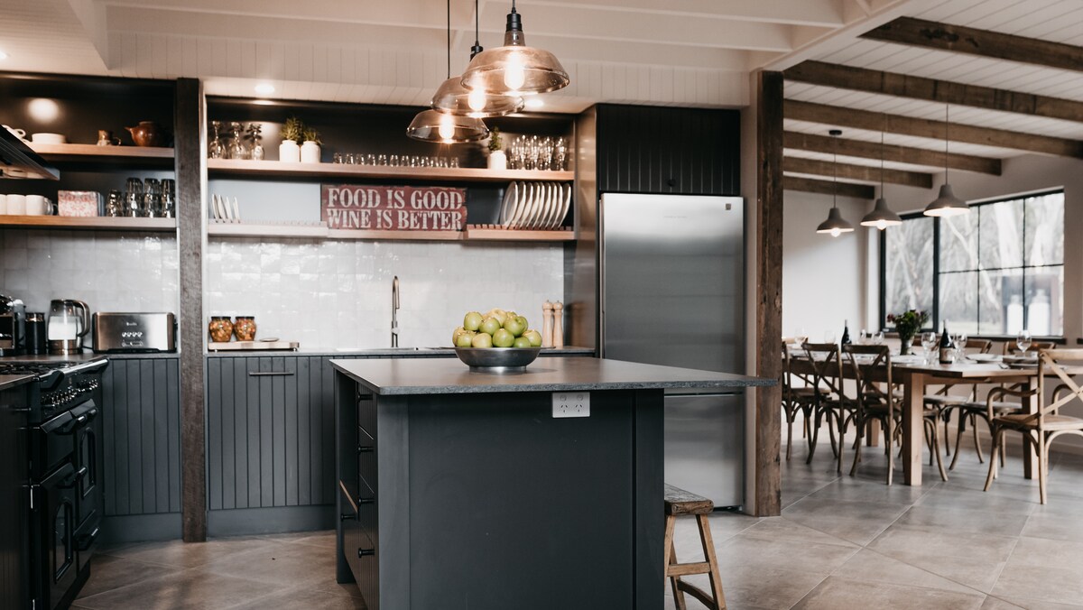 Old Shearers Quarters, pets welcome, at our property, Boloco West. Just 15 mins drive to Jindabyne. Original shed facade with renovated interior and quality inclusions. Open fire, spa, three bedrooms. Large private outdoor area with campfire, deck with outdoor dining, BBQ and hot tub. Free Wi-Fi. Our menu includes pizzas and slow cooked meals freshly prepared in our farm kitchen. Guests can walk or mountain bike around the farm and enjoy our amazing views and abundant wildlife.