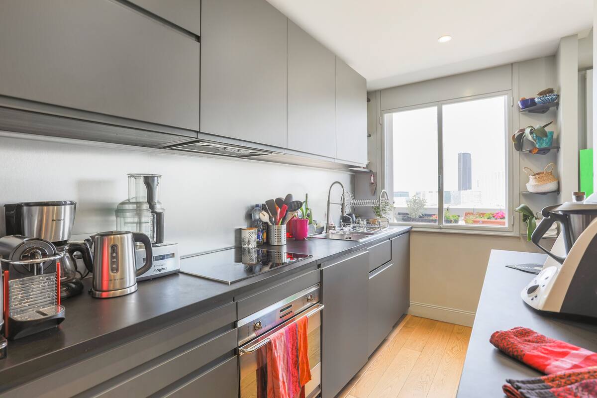Top-floor haven with a large, sunlit balcony and an unobstructed Eiffel Tower view. Newly refurbished by a designer, it features an Italian shower, a comfy queen-size bed, and a quality sofa bed for groups of 3–4. Bright living/dining area, fast broadband and Netflix. Secure building in a vibrant neighborhood packed with cafés, restaurants, and shops. Metro station just 2 minutes’ walk. Perfect for couples, friends, or business stays.