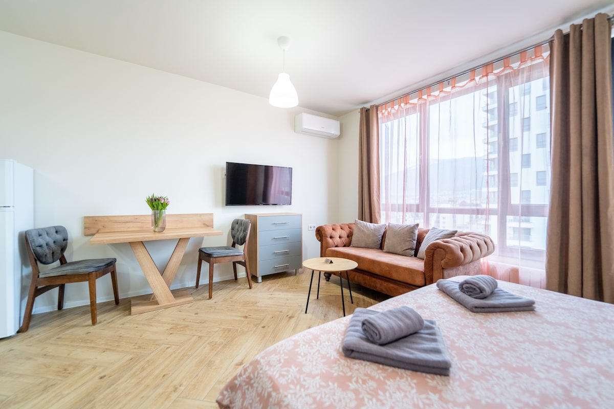 Brand new 2022 apartment, located 5 min away, walking, from New Bulgarian University. It has everything you need for your short or long term stay - king size bed, dining area, modern bathroom with toilet, fully equipped kitchen, wardrobe with hangers, WI-FI, TV, etc. It is perfect for a romantic getaway, business travels, solo travellers, students and everyone who enjoys modern designs combined with coziness and quiet atmosphere.
