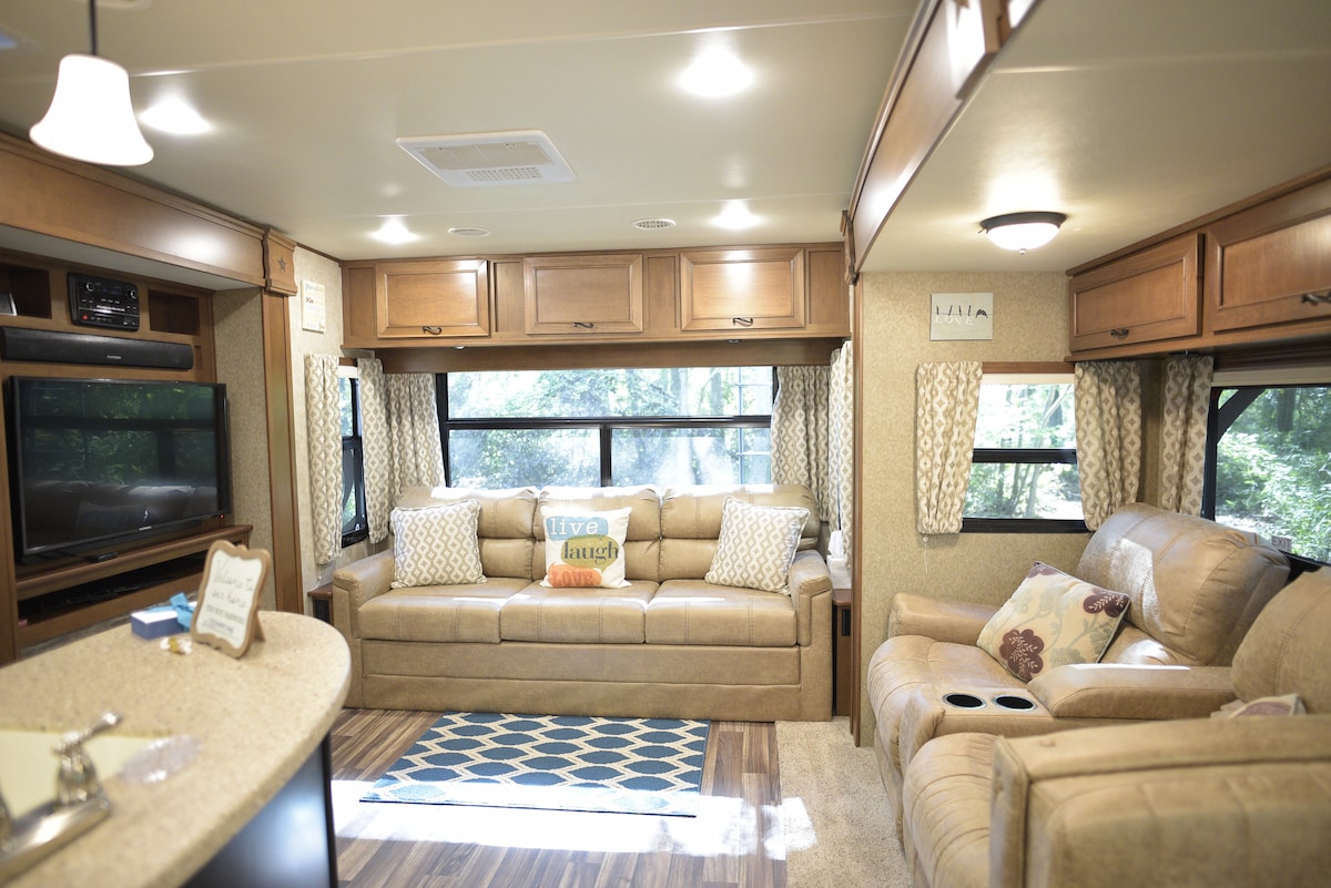 Welcome to our Cozy Camper! You will be camping with all the comforts of home in our 35 foot stationary camper that is nestled in the trees, on our 20 acre home property in the country. (It is near the road but if you can handle some occasional road traffic, you will love our place!) Enjoy hearing the birds, watch squirrels play in the trees, drink your coffee outside as the morning sunlight shines through. Enjoy a picnic or watching the stars while sitting around the Gas Fire Pit. Come Stay!