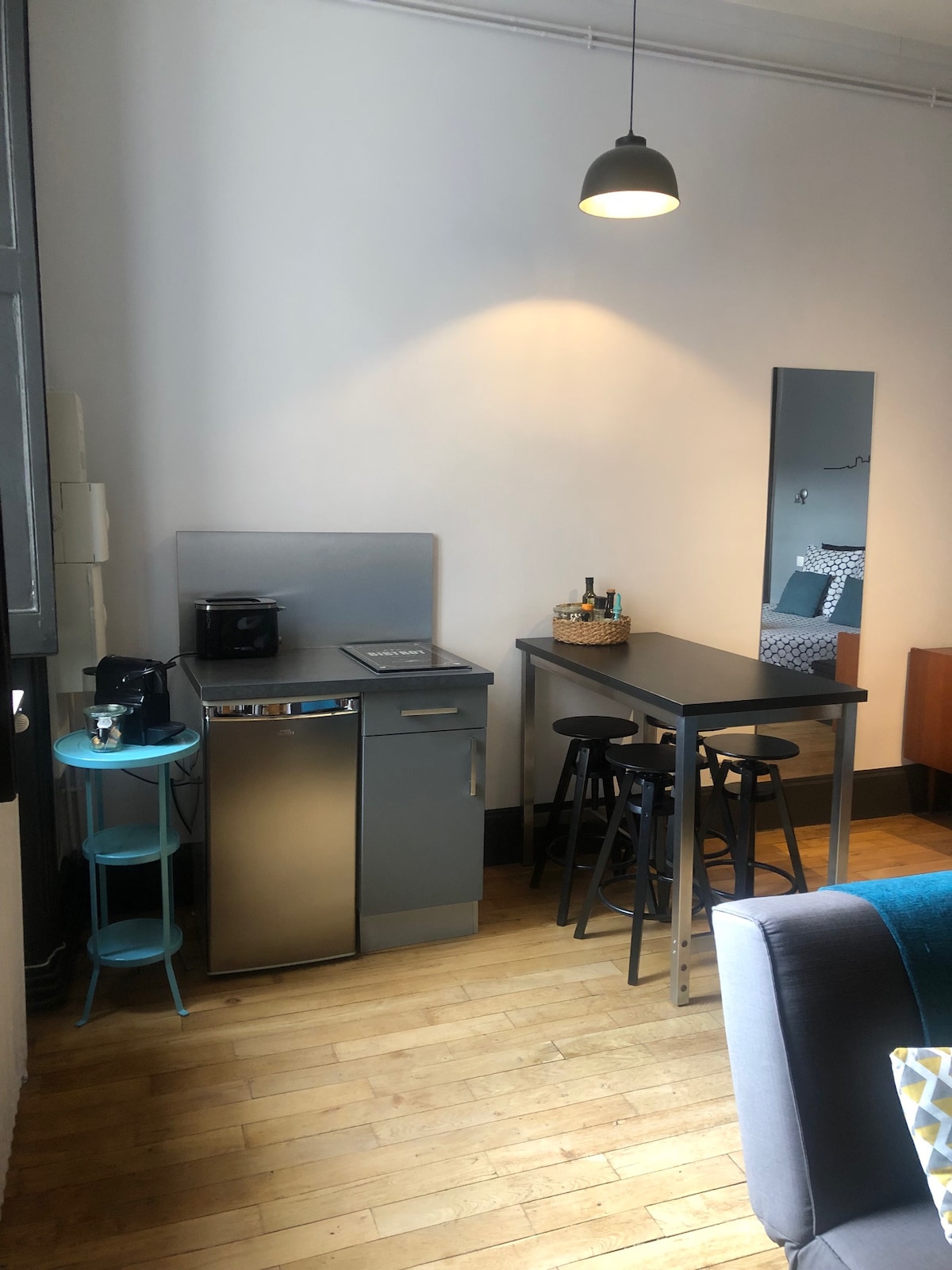 Furnished accommodation/studio 1 room), fully equipped, 17m² on the ground floor of a house, 10 min by transport from the center of Lyon. Bright, comfortable, refurbished by the owner's architect. Comfort bedding, 1 double bed of 160cm. Kitchen/bar/shower room area. Direct access to terrace+garden (100m² for tenant use). Dishwasher, oven/microwave, large refrigerator, electric hobs ATTENTION: separate toilet, on the landing. For single use tenants. Free WiFi