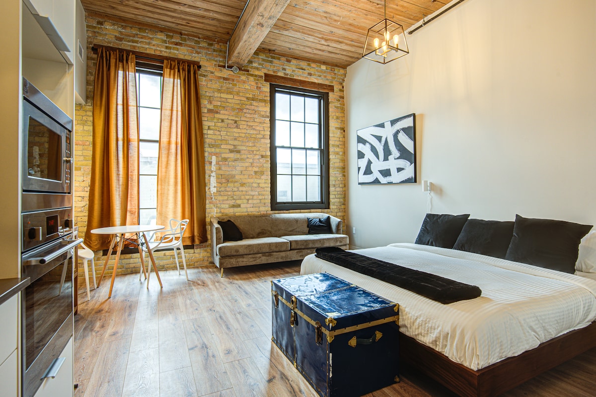 Chic King Suite at Bradshaw Lofts: The Clairemont. Discover the fusion of modern luxury and timeless design in our King suite. With a sumptuous King bed, Queen pull-out, Netflix, and a fully-equipped kitchen, comfort meets style. Just a stroll from downtown Stratford's dining and shops, and close to the Stratford Festival theatres. Experience unparalleled elegance at The Clairemont