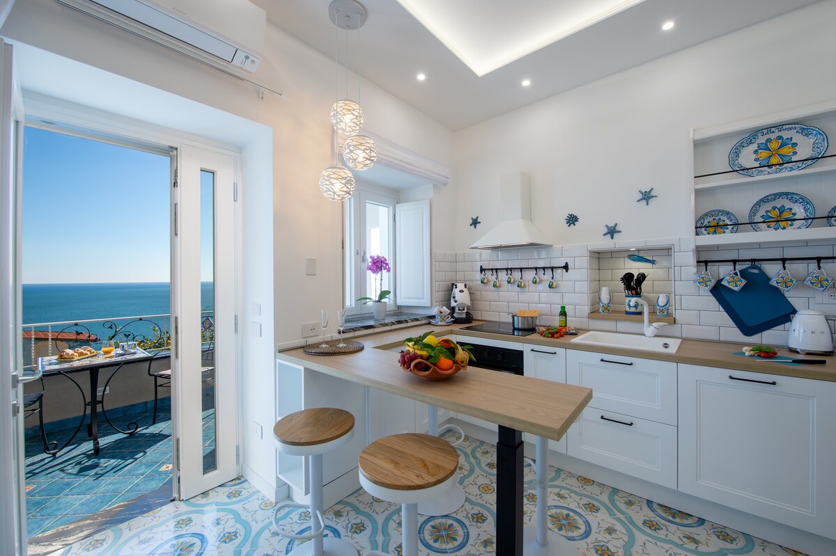 Appartamento completamente arredato. Dotato di 1 camera da letto (matrimoniale), 1 bagno con doccia e lavatrice, ampio soggiorno (con possibilità di 3° letto aggiunto), cucina attrezzata, ampio soggiorno con fantastica vista mare e di Positano. L'appartamento è situato al inizio della scala che porta al SENTIERO DEGLI DEI ed e ‘ accessibile tramite 250 scalini , l appartamento e’ adatto a persone giovani , abituati a fare esercizio fisico!non adatto a persone anziane!