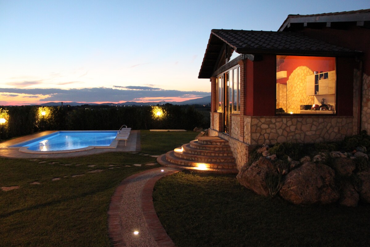 In the Maremma countryside, private panoramic swimming pool, with a 360° !!! View of the Argentario, the island of Giglio and the medieval village. Spectacular sunsets to admire! The villa is on one floor, characterized by exposed wooden beams, verandas, handmade terracotta floors, elegant minimal furniture. It can accommodate up to 6 people. Park of 2 hectares of garden with olive grove and centuries-old oaks. Located 5 minutes from the beautiful village of Pereta.