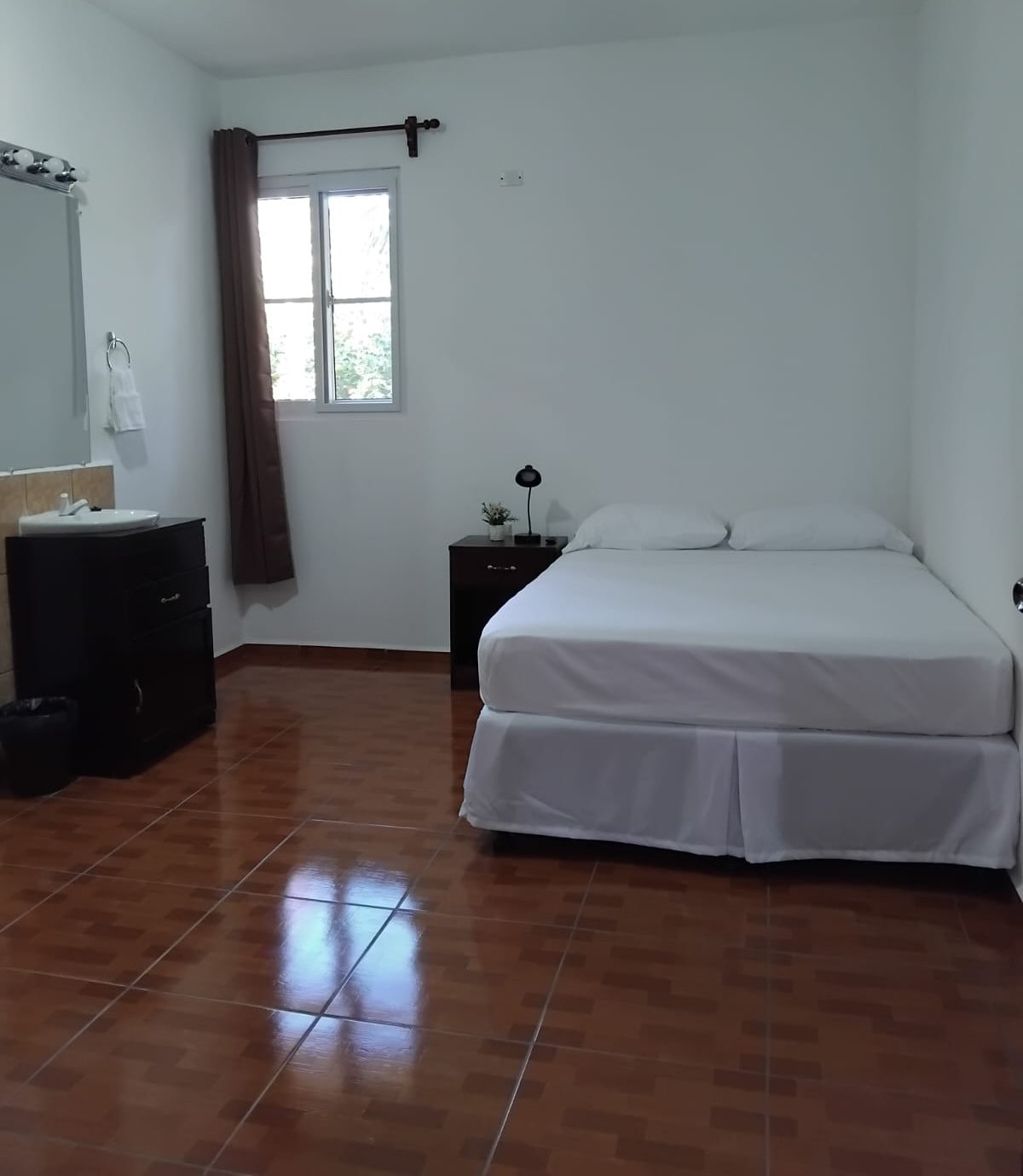 Enjoy a tropical experience in our modern and comfortable room, located just 5 minutes from the charming Isla de Flores. Relax with air conditioning after a day of adventures, and enjoy a refreshing dip in the pool or quiet moments in our open spaces surrounded by nature. We are just 200 meters from the bus terminal and the central market of Santa Elena, perfect for exploring the area with ease!