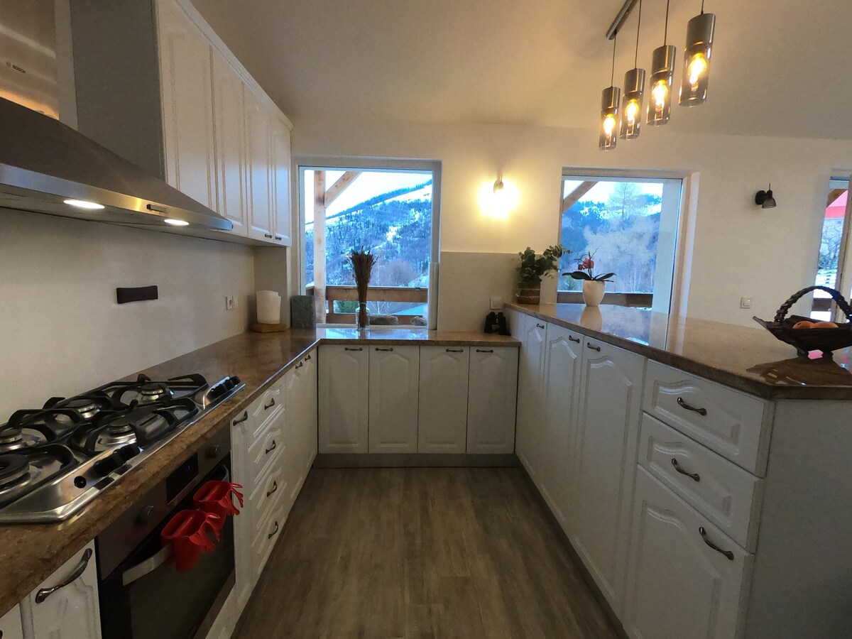 The cottage has a spacious living room with a sofa bed. In the living room there is a fireplace and next to it there is the kitchen equipped with refrigerator, stove with oven, coffee maker, fruit juicer, dishwasher, microwave and other utilities. The house also has a washing machine. Upstairs there are 2 bedrooms, each with a bed for 2 people. The accommodation capacity is for 6 people (4 in the bedrooms and 2 in the living room, on the extendable sofa)