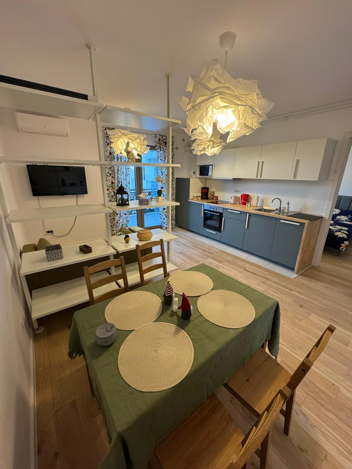 Apartament nou, luminos, cu design modern și parcare gratuită. Se poziționează la intrarea în Timișoara, în vecinătatea benzinăriei Esso. Apartamentul este dotat cu: -bucătărie complet utilată cu cele necesare: plită electrică, cuptor, mașină de spălat vase, frigider, aparat de cafea și veselă. -sufragerie open space în care oaspeții se pot bucura de un film, pe o canapea confortabilă, la un televizor Smart -dormitor cu pat matrimonial -baie cu cabină de duș și mașină de spălat rufe cu uscător.
