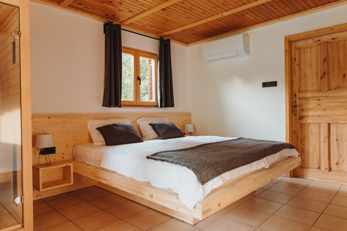 The cottage with two apartments is situated in a beautiful countryside, in the middle of a large meadow surrounded by forests and hills. In an authentic rural setting, with beautiful views, in a tranquil atmosphere, with no neighbours nearby, you will truly relax. You will be able to go hiking in the surrounding hills, which are up to 1000 m high.