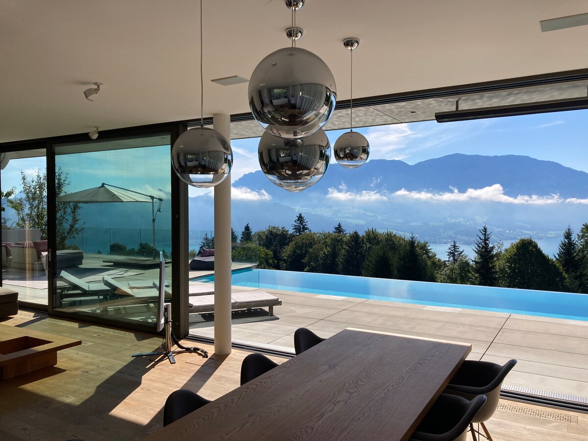 Top modern, new and Contemporary Villa with 13 m Pool (heated at a surcharge in winter), Sauna and all amenities, beautiful location and the very best views over lake attersee, the salzkammergut and the close mountain range of Höllengebirge and the Dachstein glacier. Very close (35 min) to Salzburg city and Hallstatt (40 min), whole Salzkammergut like Sankt wolfgang/Wolfgangsee (30 min) or bad ischl (30 min) or mondsee (15 min). Very calm and far away from everything if you need tranquility.