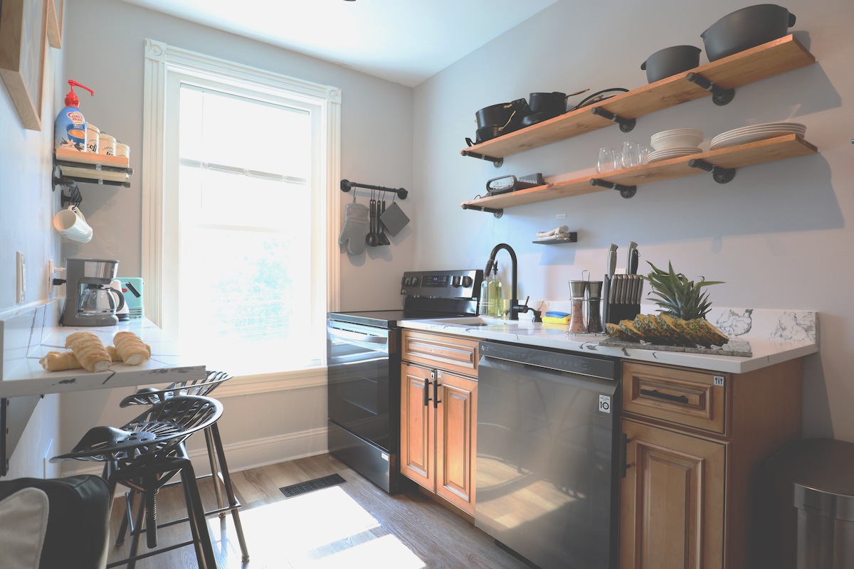 3 Bedroom, 2 Bath 3 Queen Beds Whether you’re in Philly for history, business, or a weekend escape, this spacious three-bedroom makes it easy to settle in. You’ll have a full kitchen, in-unit washer/dryer, a dedicated workspace, and a comfortable layout for groups—plus access to standout building amenities like a gym, coworking space, and community lounge—right in Old City near Independence Mall. Note: Some units of this type are located below an event space and may experience noise on some Th
