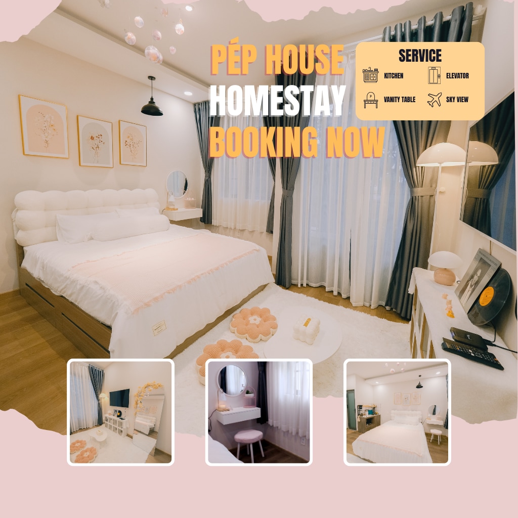 Pép XANH Room is a peaceful stopover just 800m from T3 station. Blue-White Studio tone combined with cozy wooden furniture, elevator and full amenities like at home. Highlights: ✈️ Balcony with a view of the plane 📺 55" Smart TV & Powerful Wifi 🍳 Kitchen with all spices & utensils 🛁 Full of personal hygiene items 🛗 Convenient elevator Automatic check-in. Perfect for resting before a flight or working remotely (Work-cation).