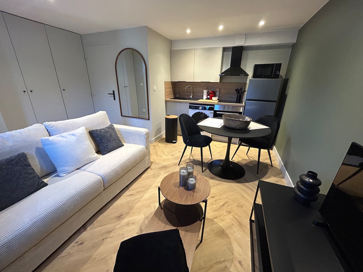 SAINT GENIS LAVAL: a few minutes from the Henri Gabriel Hospital and Lyon Sud Pierre Bénie Hospital - Cozy 2-room apartment completely renovated in March 2024. Want to make your stay in Lyon UNFORGETTABLE and AUTHENTIC? Accommodation with portable AIR CONDITIONING with window extraction and two fans - Air conditioner since August 2025 to stay cool after a day of sightseeing. → You are looking for an authentic apartment that is cheaper than a hotel