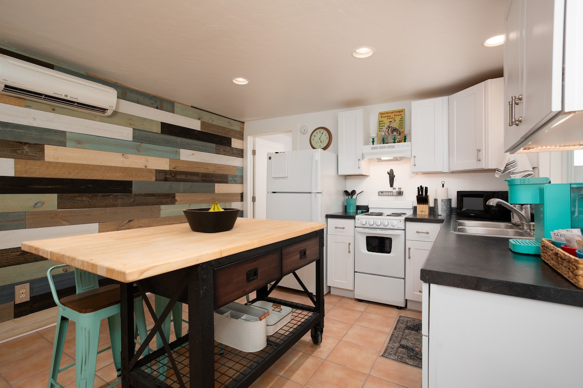 Perfect for a weekend getaway or a long-term stay, our casita in midtown is fully equipped with everything you need to experience all that Tucson has to offer. 344 sq ft, this small and mighty space offers a fully-equipped kitchenette, theater-quality entertainment center, high speed wifi access, and washer and dryer access. Enjoy the spacious patio while you sip morning coffee or grill in the evening. You may find it hard to check-out of this cozy gem!