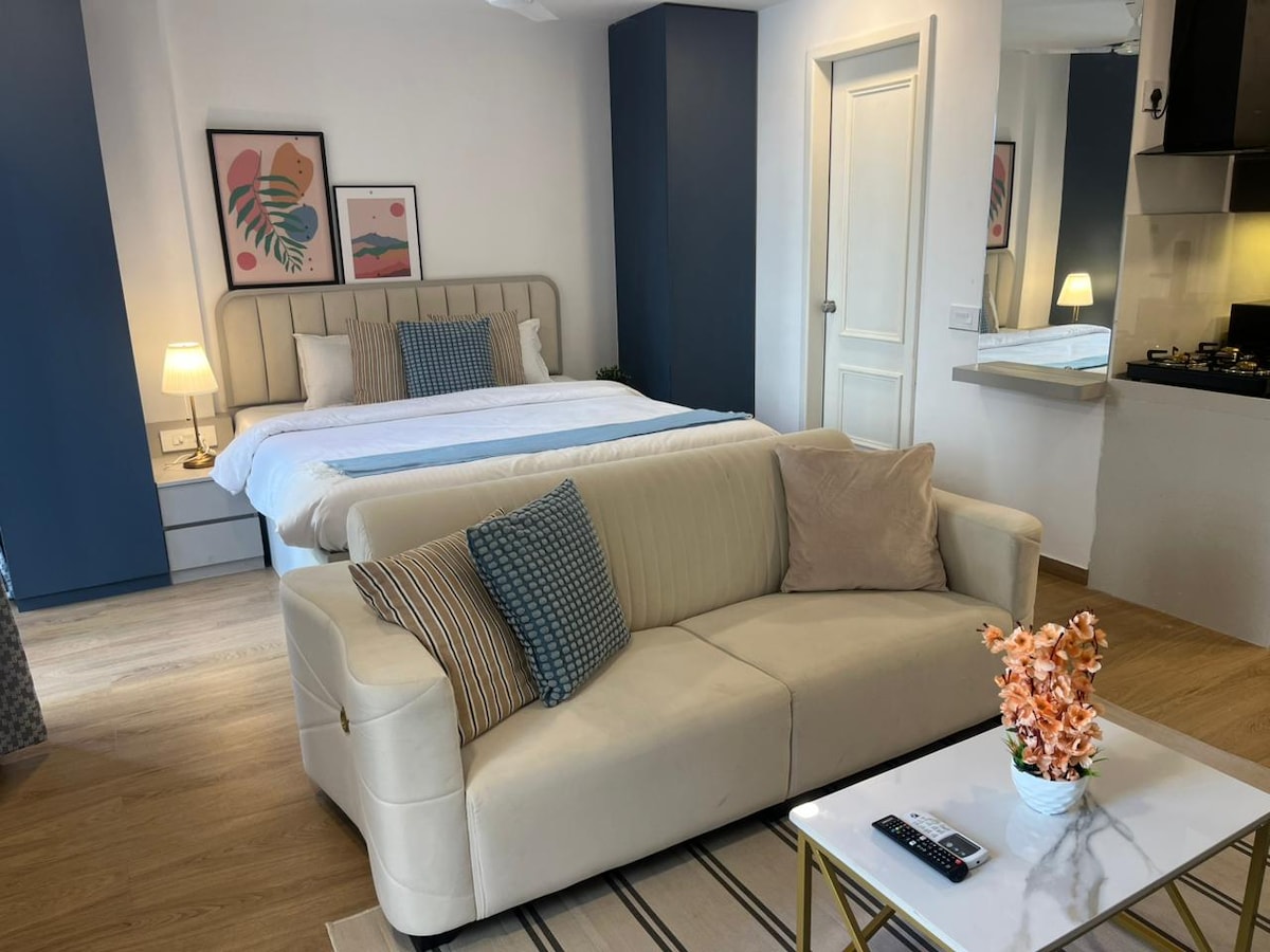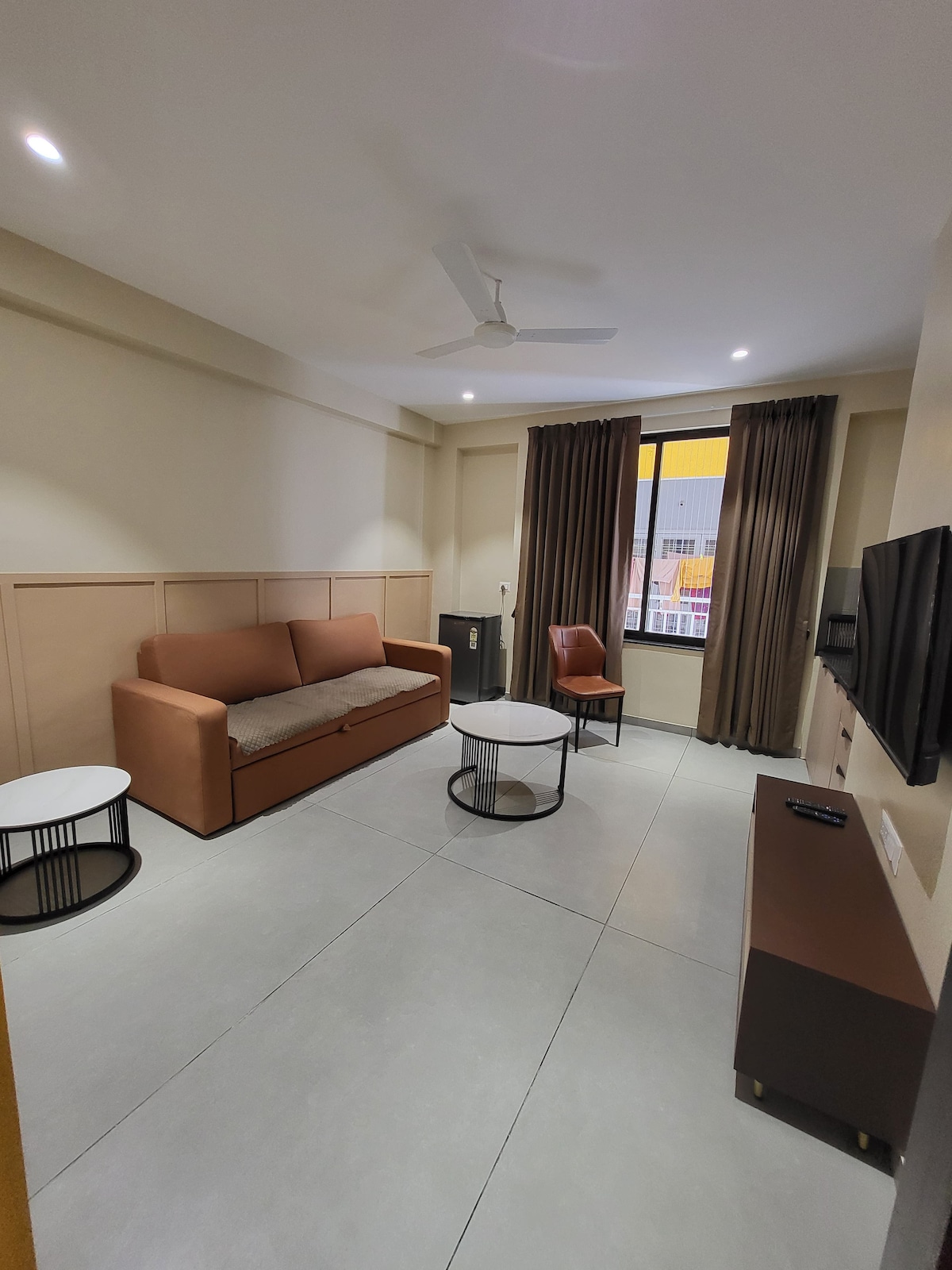 StayBird - Divine Suiites, where Family comfort meets modern luxury in our Premium 1 Bedroom Family Apartment. Spread out and relax in style with ample space including a cozy living area, 2 balconies offering scenic views, kitchenette for your convenience. Enjoy entertainment with two TVs and gather around the dining table. Unwind on the comfortable sofa after a day of exploring Pune's attractions. Perfect for families or groups, We offer a comfortable retreat in the heart of Kharadi.