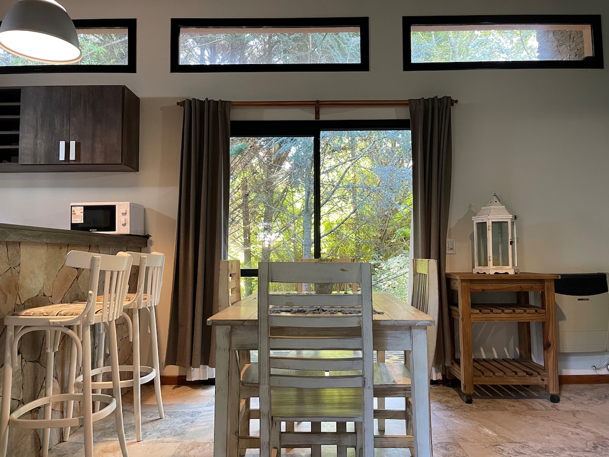 Ideal for resting. Cabin in the Villa Alpina complex. Very close to the beach and the Carilo shopping center. In the bedroom 1 double bed + 1 mattress + 1 practical bed. In the living room a sofa bed for 2 people. Full kitchen with table. Refrigerator, microwave, oven. Balcony with grill and views of trees. 1 full bathroom. Wifi, 2 TVs, Netflix. Heated pool, jacuzzi, sauna, locker room, gym and children's games.