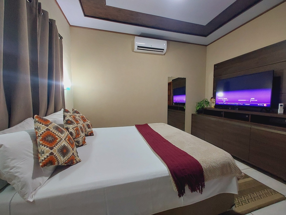 Acomodações: 4 suítes confortáveis, todas equipadas com ar-condicionado Ambientes limpos e organizados Lazer e Conforto: Piscina privativa com cascata e iluminação em LED Varanda Gourmet e Cozinha Gourmet completa, equipada para refeições e momentos de convivência Cozinha equipada com: Geladeira Fogão cooktop Forno micro-ondas Sanduicheira Chaleira elétrica Liquidificador Filtro purificador de água