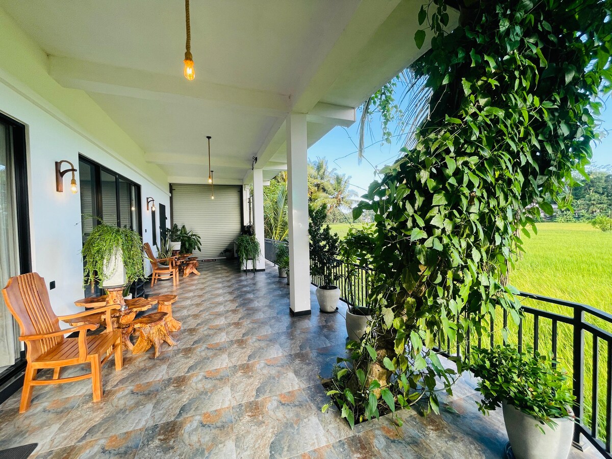 Escape to tranquility at Nuki Eco Villas, nestled amidst lush paddy fields and offering stunning views. Our cozy villa, perfect for 2 adults and 1 child, provides a peaceful haven for relaxation and remote work. Enjoy easy access to the pristine Weligama beach, just a short bike ride or tuk-tuk journey away. Immerse yourself in nature's beauty while practicing yoga in our serene surroundings. with wifi, Nuki Eco Villas is your ideal destination for a rejuvenating getaway.