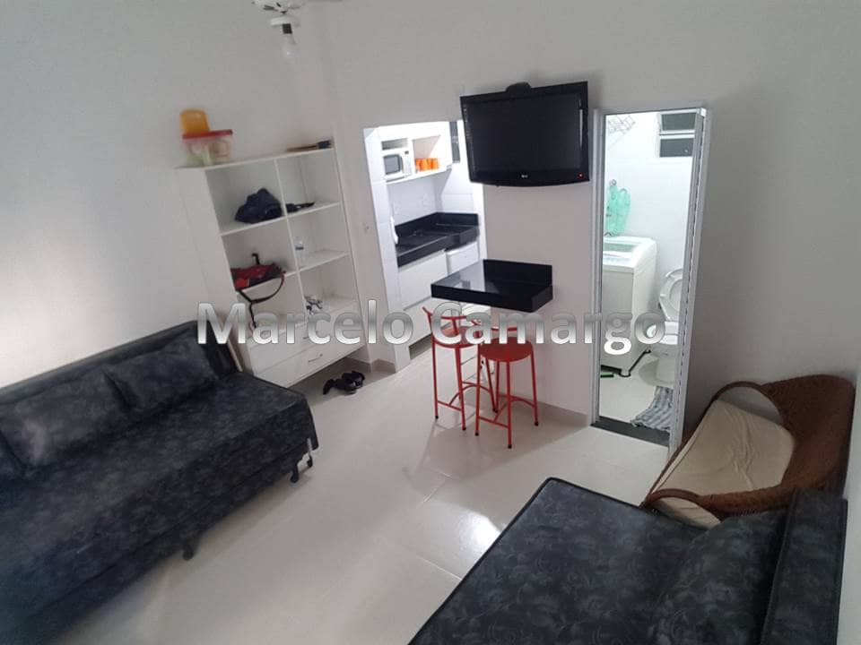 ATTENTION: NEW YEAR'S MINIMUM 5 DAYS!!! Studio apartment, consisting of a double box bed, 32" Smart TV, Netflix and Wi-Fi internet, split air-conditioning, complete American kitchen: stove, oven, microwave, refrigerator and kitchen utensils, washing machine. Bathroom with shower, hand shower. Bed and bath linens. Building facing the sea. Surrounded by shops, Pompeia Beach. Between channel 1 and 2.