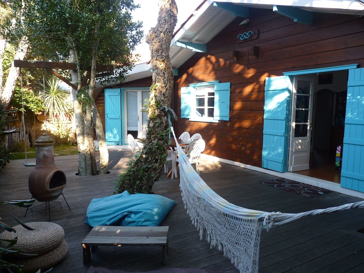 500 m from the beaches and the city center, located between lake and ocean, the villa Brise de pin is nestled in a beautiful fenced garden of 2000m2 planted with pines and cork oaks. It is decorated with a heated salt pool from May to October. With its 5 bedrooms, 3 bathrooms and high level of services and equipment (poolhouse, plancha, bowling, bicycles...), the house can accommodate 8 to 10 people and promise a stay in any point unforgettable near surf spots