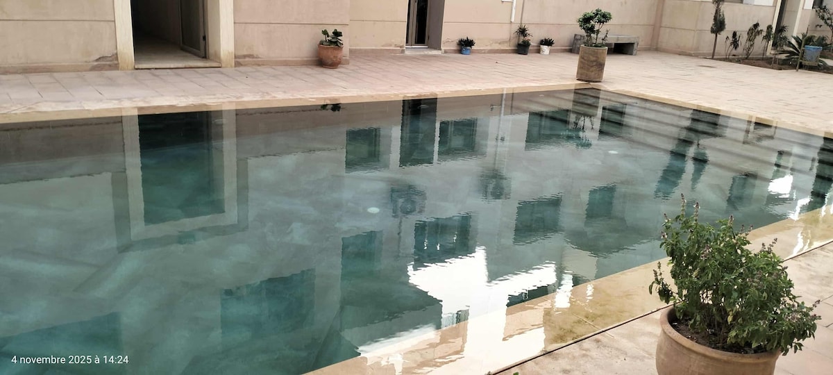 🏡 Maison neuve, dans quartier sécurisé avec caméras. Matériaux traditionnels : tadelakt, mosaïque, esprit sobre et lumineux typique ☀️ Lumière & calme:Terrasse ensoleillée toute l’après-midi, sans courant d’air. Piscine privée sans vis-à-vis. 📶 Fibre Wi-Fi très rapide, la climatisation est sous supplément 🚕 Accès facile : À 10 min du centre, taxis et parking devant. 💬 Accueil 24–48h avant l’arrivée, personne dédiée disponible sur le chat