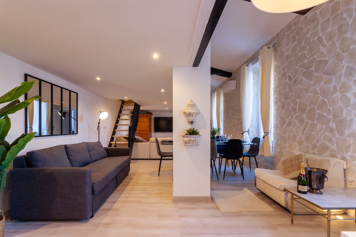 BREATHTAKING PENTHOUSE in the trendiest part of Cannes, le SUQUET (historical center) WITH A PRIVATE SAUNA High-speed fibre optic internet PERFECT FOR HOME OFFICE, WORK, MOVIES. Brand new renovated with the perfect French touch : modernity, comfort and tradition. Perfect for BUSINESS TRIP and family. Charming terrace view on the castle of the old Cannes. 3 bedrooms 3 baths 5 min Palais des Festivals 5 min Forville market (fresh trendiest old market) 1 block from the sea (les plages du midi)