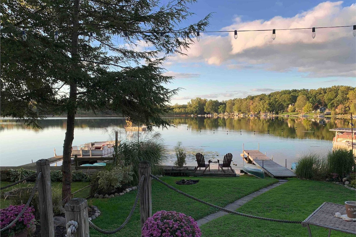 Nestled in a small cove on a large lake, this waterfront cottage has been completely renovated. It has 66' of private shoreline; an elevated front deck plus side patio; and stone bonfire pit & gas BBQ grill. Guests also get FREE & exclusive use of pontoon boat, 2 kayaks and paddle boat, plus private dock (early May through late October, weather permitting). Swan Cottage is very dog-welcoming. The yard is not fenced, however we provide ground stakes & cable ties.