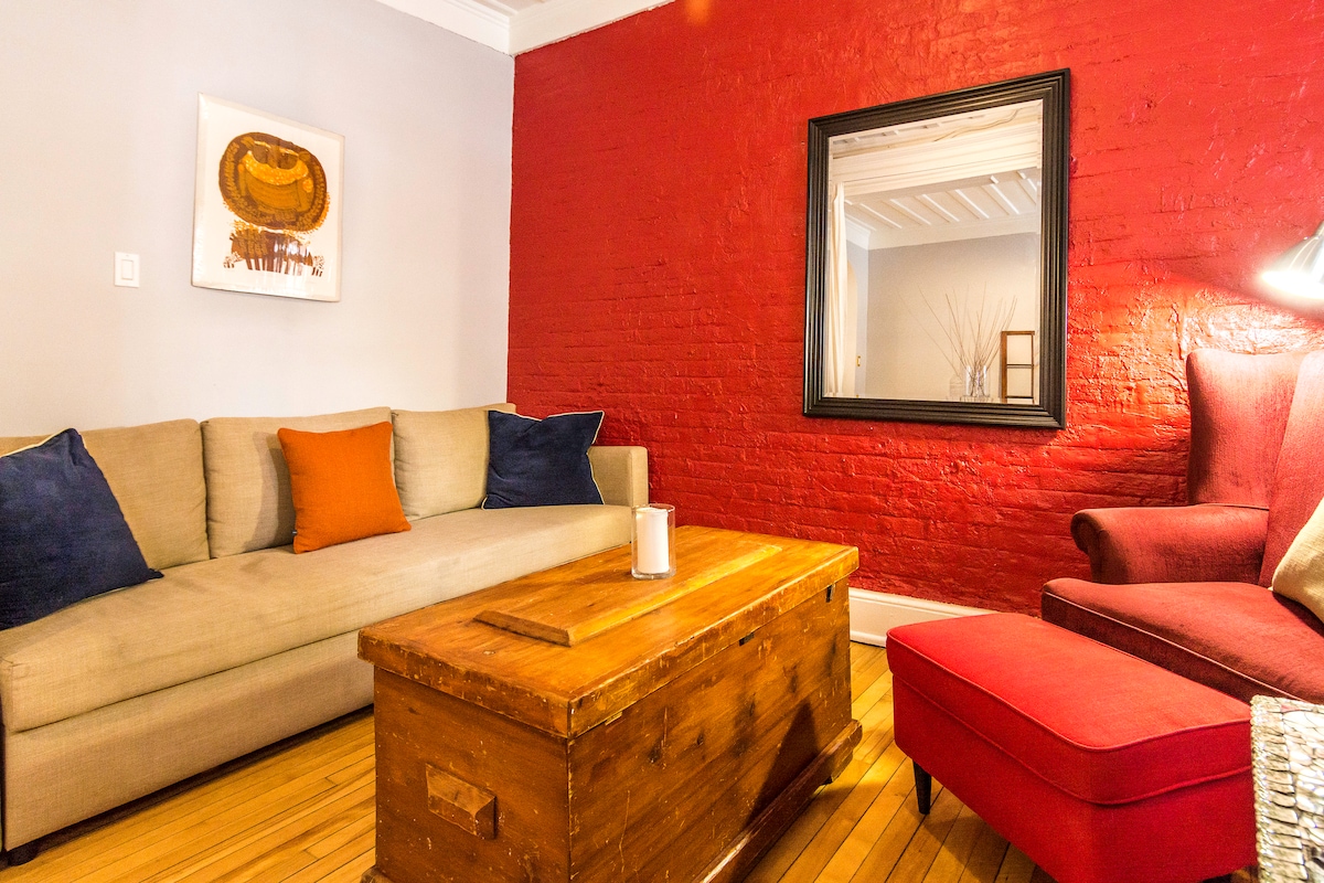 Available for Monthly/Yearly Stays - Please Contact Up to 5 guests, this beautiful unit has 2 private bedrooms with 2 queen size beds + a one place murphy bed for a 5th person (prepared on demand 25$ charge for it). Located on one of the most beautiful streets with many art galleries, fines restaurants and shops. High quality design, modern kitchen, all included. Private parking spot, table for 6, 12ft ceilings. cozy living room. A/C, 52"TV / private balcony