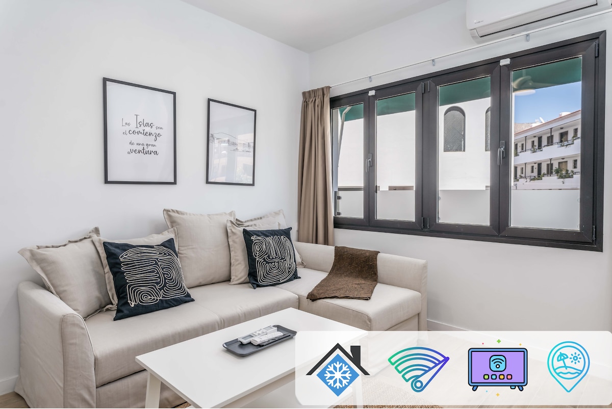 Beautifully refurbished 2-bedroom apartment located in the heart of Los Cristianos: 5 minute walk to the beach and in the center of all commercial activity Completely equipped for a great vacation: master bedroom with a double bed, second bedroom with two single beds, free Wi-Fi, Smart Samsung TV, Air Conditioner (both bedrooms and living room), safe deposit box, kitchen utilities. The bathroom is equipped with a washing machine, hair dryer, towels and mats. Fresh bed linens in the bedrooms.