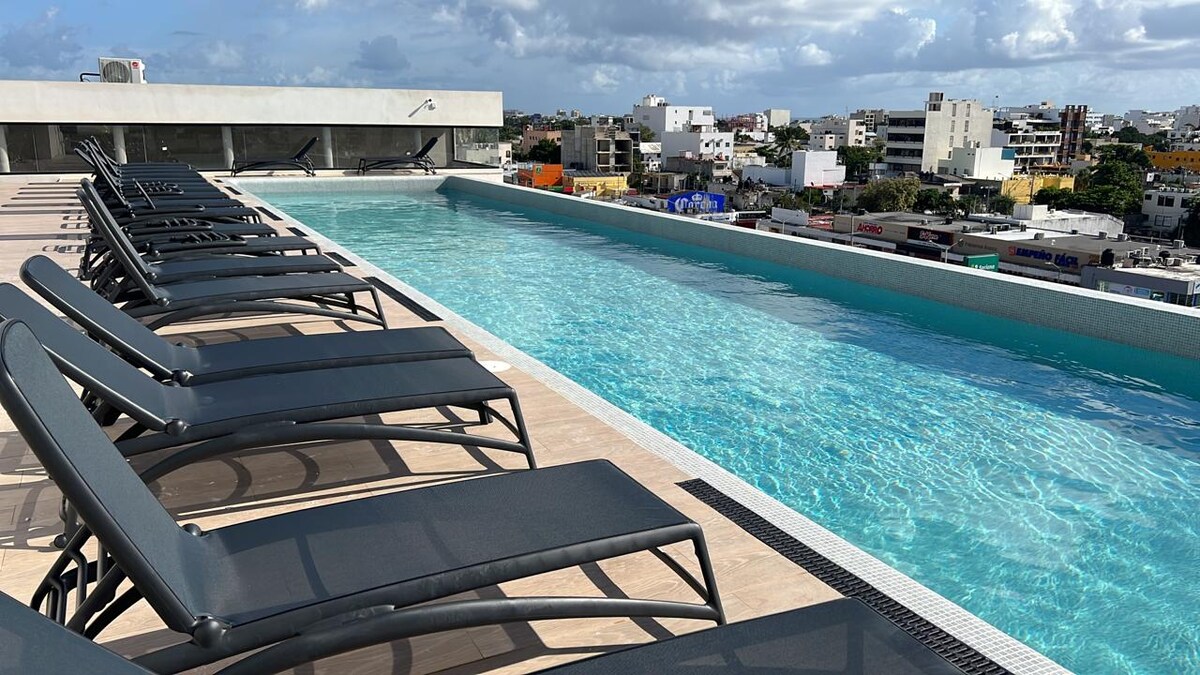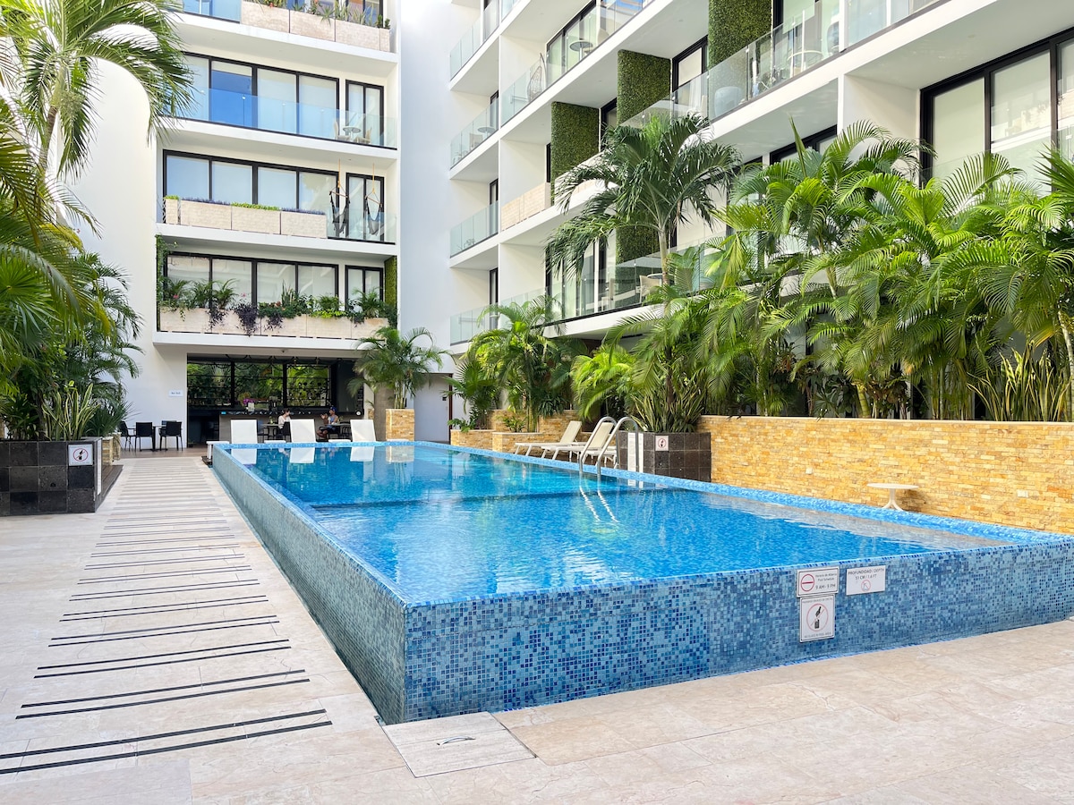 ASK FOR DISCOUNT! I have an offer for you. Pools with heater NEW Playroom, SPA, sream room now open. Free parking. Services included. The largest in building 68m2 (732ft2) 1 bedroom apartment excellent for vacation or work with amenities. Ask promo with bikes, GYM, Cinema, inside coffee shop, 5 min to restaurants in la Quinta Avenida and the beautiful beach. Chichén itza ruins, Tulum, Xcaret, Cozumel Do remote working or splash in our 2 swimming pools, watch the sunset with drinks at rooftop