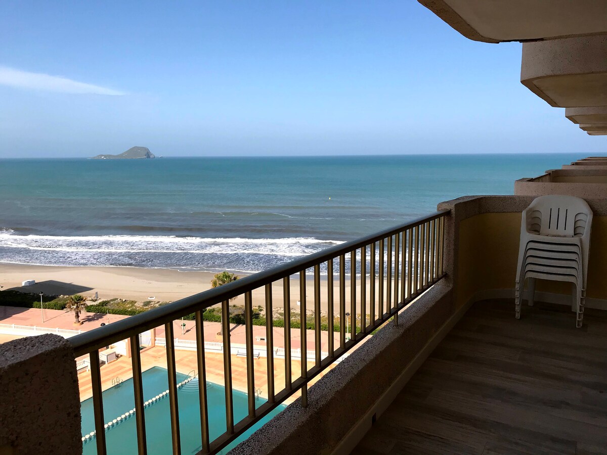 Espectaculares atardeceres. @vistaslamanga en Instagrm Aire acondicionado y vistas en todas las habitaciones y salón. TV Parking privado. Muy luminoso, Km-3 La Manga Playa semiprivada y cerca campos golf Dos piscinas, acceso directo a la playa Deutsch, Englisch, frances Hasta 3 dormitorios , 5 camas, 2 baños y 1 aseo. Cocina, salón, terrazas verano e invierno. Totalmente amueblado, TV y wifi Urbanización cerrada, portero 24 h