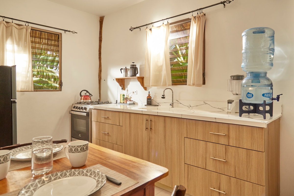 Working remotely and looking for an inspiring place, nature time and a comfortable place to work and live? Casa del Arte is located walking distance from the beach, has a beautiful ocean view with the sun setting right in front. Everything you find in this place is local craftsmanship, from the coffee cups, to the furniture, to the tiles.. Get inspired by the colonial feel, while enjoying amenities like AC, hot water shower a fully equipped kitchen and fiber optic internet