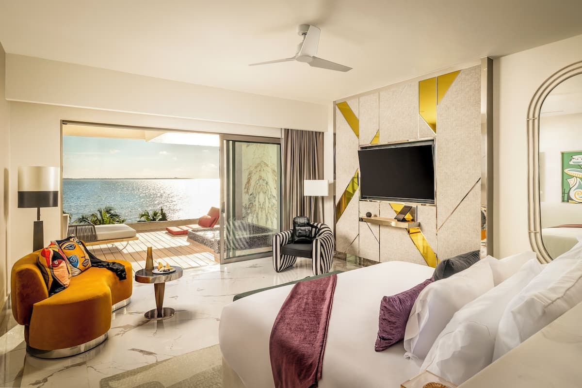Directly on the beach. Views are spectacular as soon as you walk through the front door. Both the living room and the bedroom have views of the sea. Facilities like pools, jacuzzi, lounge chairs, shades, gym, tennis court are available for you (for free) High speed Wifi All inclusive optional through the hotel for food and drinks as we share facilities with Oleo Cancun resort (today $95 usd p/p per day) There are also 3 restaurants across the street (a la carte) + a convenience store.