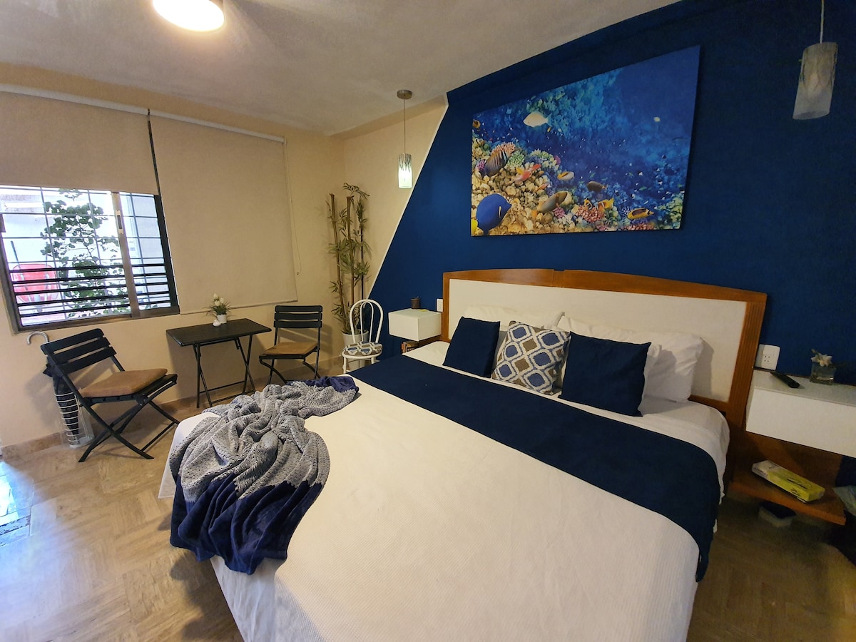 Comfortable and nice private apartment in a quiet area of Isla Mujeres, located right in the middle of the island 10 minutes from the maritime terminal and a few steps from the Caribbean Sea walkway. We offer you a space completely designed and equipped for you. We have a double bed, air conditioning, TV (in the bedroom and in the living room), clothes iron, hot/cold water, equipped kitchen, refrigerator and internet.