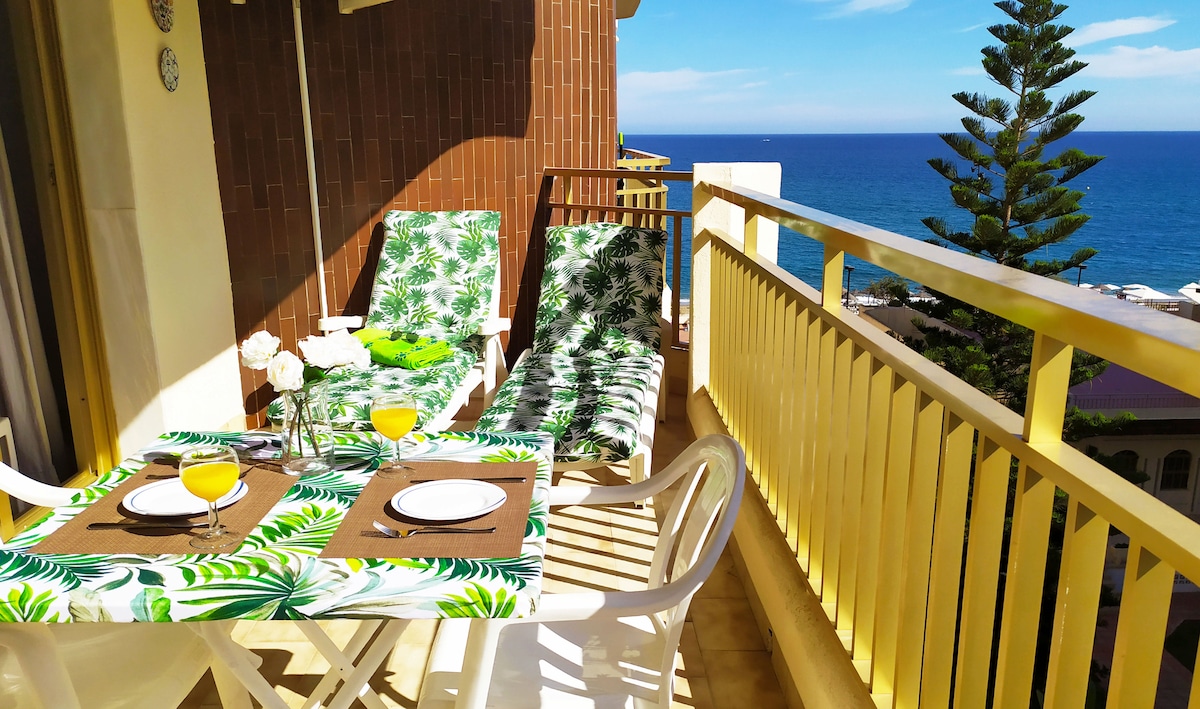Sea-view duplex | 5 min walk from the beach. Inside Wyndham Resort with terrace, pool, and festival views (Malaganostrum). Near Fuengirola, A-7, and Málaga Airport: - Spacious and comfortable double bedroom suit | seaviews. - Second bedroom with 2 single beds. - Open-plan living area with double sofa bed. - Family friendly bathroom. - Cosy toilet ground level. - Full kitchen: Refrigerator, micro, ceramic cooktrop, oven, Nesspreso... - Private terrace perfect for enjoying the outdoors | seaviews