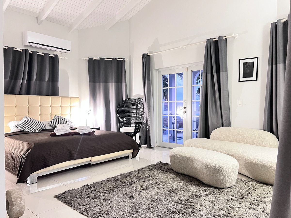 This unique 3D-printed concrete house features a private cave with direct ocean access. Step from the bungalow into the cave, and dive into the crystal-clear Caribbean waters. Spot dolphins, tuna, and vibrant coral while snorkeling. We provide the gear, cooling jug, sups for free. Enjoy a cocktail in the cliffside jacuzzi with stunning sea views and the best sunsets on the island. The property has two private, mirror-image bungalows. Contact us to rent both, to have everything exclusive.